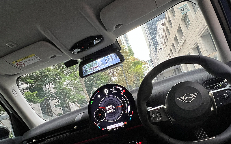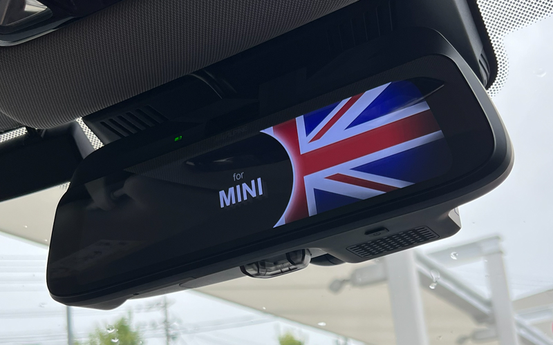 ETC内蔵のルームミラーに準じたプロダクトで、純正のイメージを損なうことなくデジタルミラーが装着可能。エンジン始動とともに起動。粋なオープニング演出もあり。オープニング画面はBMW用とMINI用にそれぞれ3種類計6種用意。お好みでチョイス可能。 |